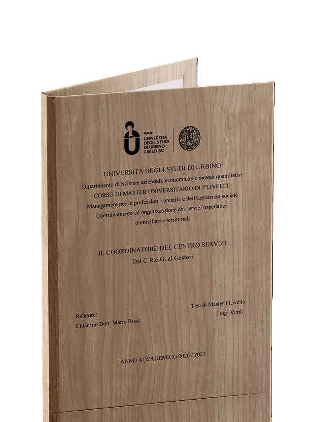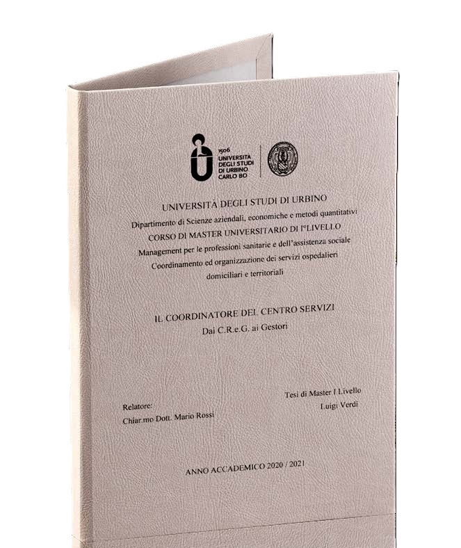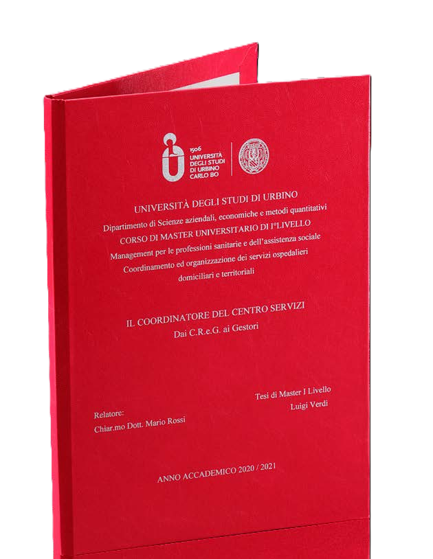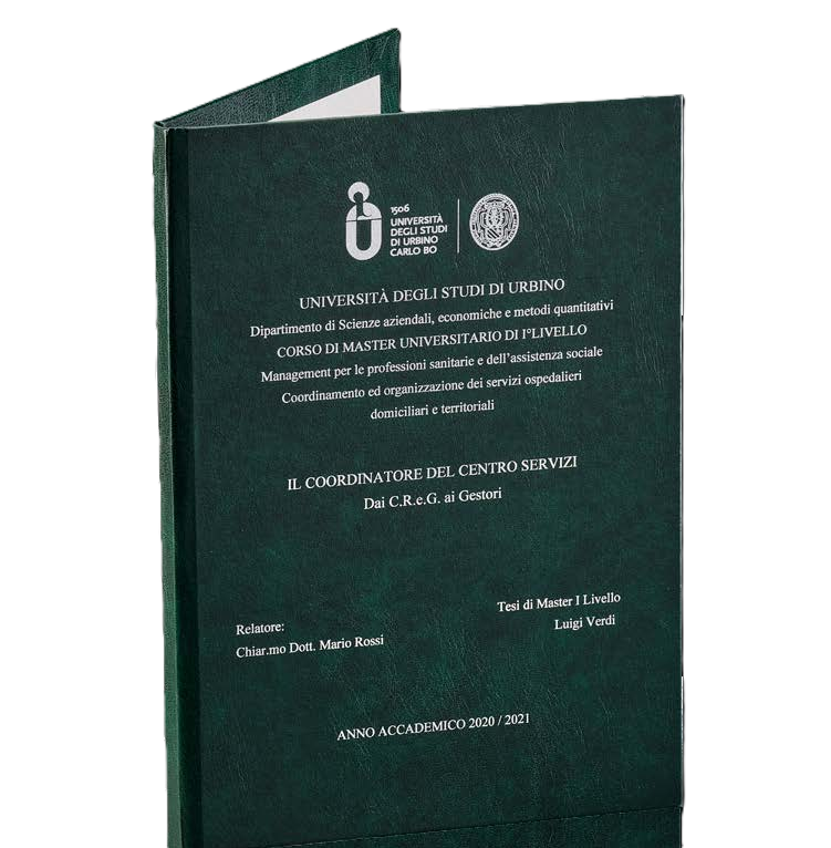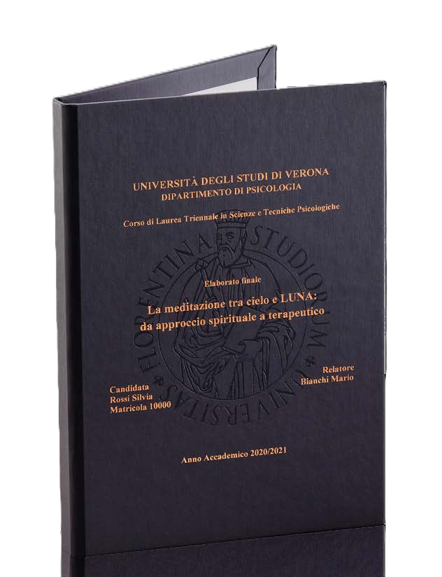 Su Atelier della Tesi puoi ordinare la personalizzazione della tesi di laurea: scegli il tuo stile, il tuo materiale, i tuoi dettagli. Dalle copertine in diversi materiali alle finiture, fino alla possibilità di inserire l’immagine che vuoi come copertina, ogni tesi viene pensata per raccontare la tua storia e valorizzare il traguardo che hai conquistato.